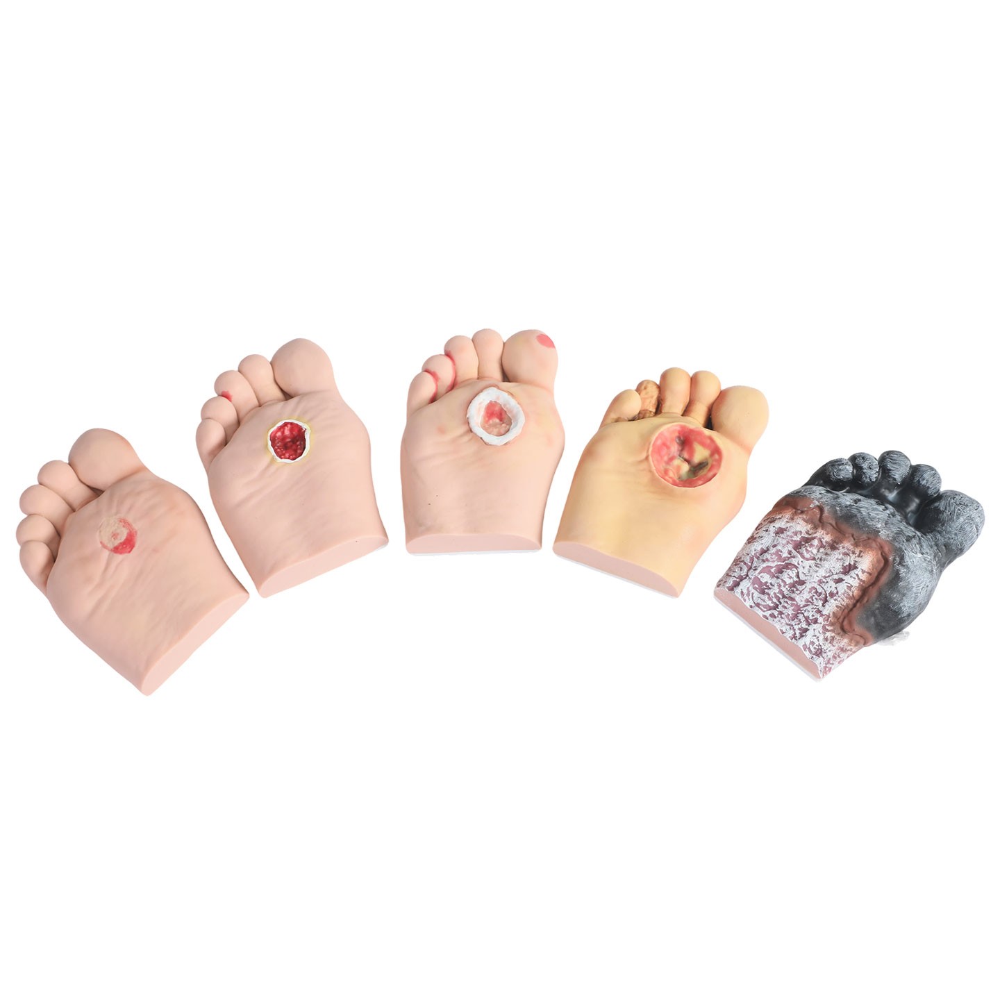 主要功能:模型设计为糖尿病导致的足部病理变化,学员可进行病变的护理。5种程度的糖尿病足展示。展示严重的足部病变,如脚趾截肢、夏柯氏足和坏疽等。模型材料柔软有弹性,脚趾可弯曲。